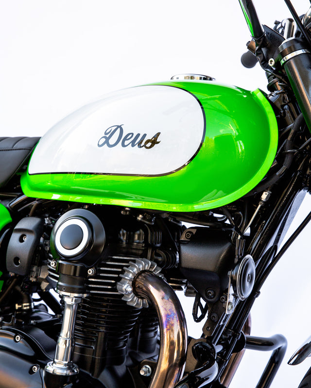Tangki berwarna Kawasaki Racing Green dari Colour Fuel, dipadukan dengan side panel Pearl White, menciptakan kontras klasik yang elegan di atas basis Black Edition yang dibiarkan utuh. Setiap elemen diukur dan dipilih dengan sengaja, membiarkan motor ini berbicara tanpa perlu berteriak.