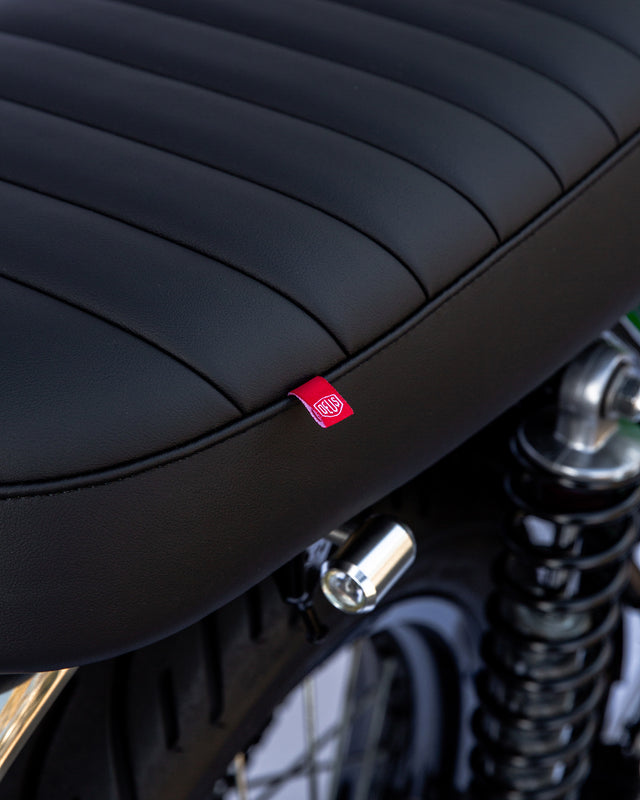 Area kokpit diracik dengan fokus pada gaya dan kenyamanan. Speedometer dan tachometer bawaan pabrik dipertahankan sebagai penghormatan pada sejarah motor ini. Stang krom yang sedikit lebih tinggi dan lebar memberi posisi berkendara yang lebih mantap, sekaligus sentuhan tradisional yang kuat. Jok dire-trim dengan vinyl hitam klasik bermotif tuck-and-roll, menyatukan kenyamanan dan estetika abadi.