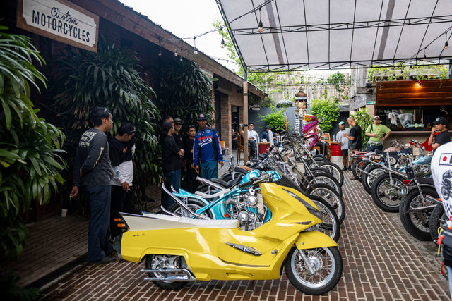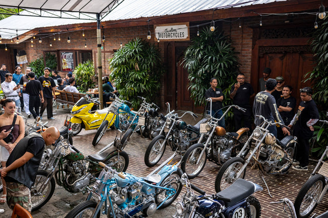 Di bagian belakang dekat Bengkel, yang telah dipoles dan rapi, kami menampilkan koleksi besar motor kustom yang dibangun oleh berbagai bengkel dari seluruh Bali. Semua sepeda motor tersebut telah dipoles dengan rapi dan berkilau di bawah sinar matahari sore. Nyenyok dan kawan-kawan juga menggelar demo pinstriping helm, lalu menjual helm yang sudah dipersonalisasi.